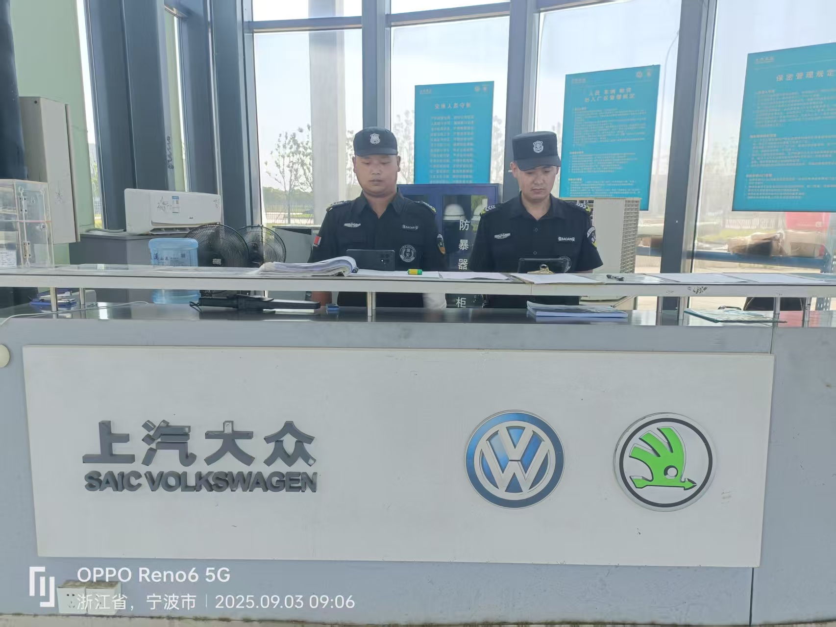 宁波余慈保安公司的保安队员们利用休息时间和执勤间隙,通过手机、值班室电视等多种方式收看阅兵盛况。队员们身着统一制服,保持整齐姿态,神情专注地观看屏幕中展示我国国防力量现代化的进程。